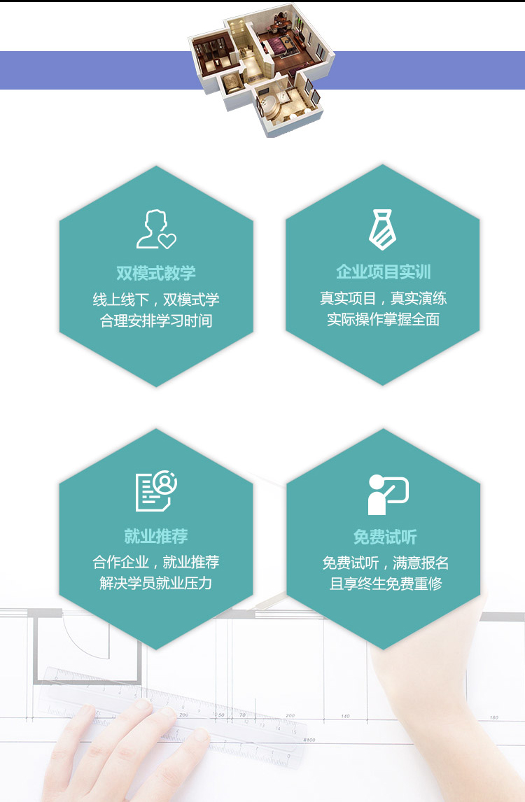 学习内容:设计原理、材料工业与装饰构造、装修预算、宣讲文案制作、草图大师、AUTO CAD (含施工图全案课程)